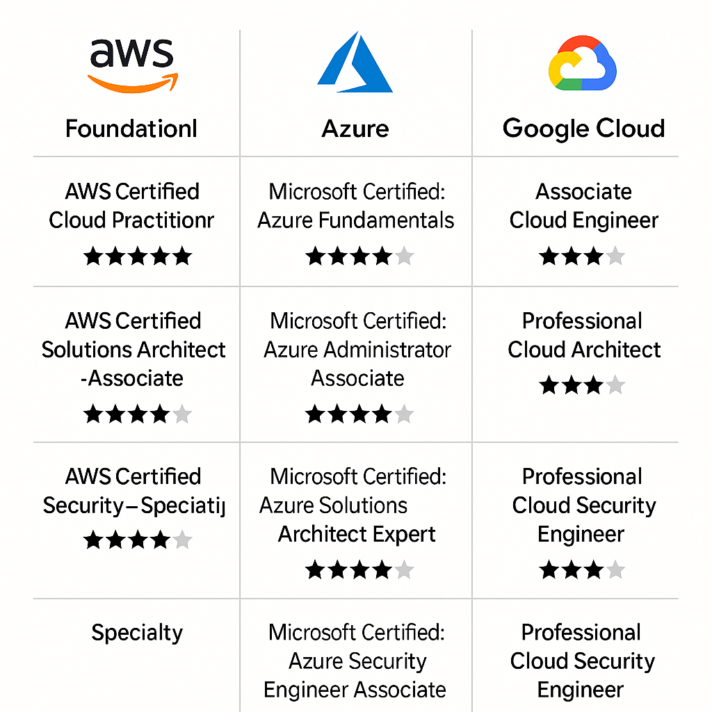 • Google Cloud: Cloud Digital Leader → Associate Cloud Engineer → Professional Cloud Architect